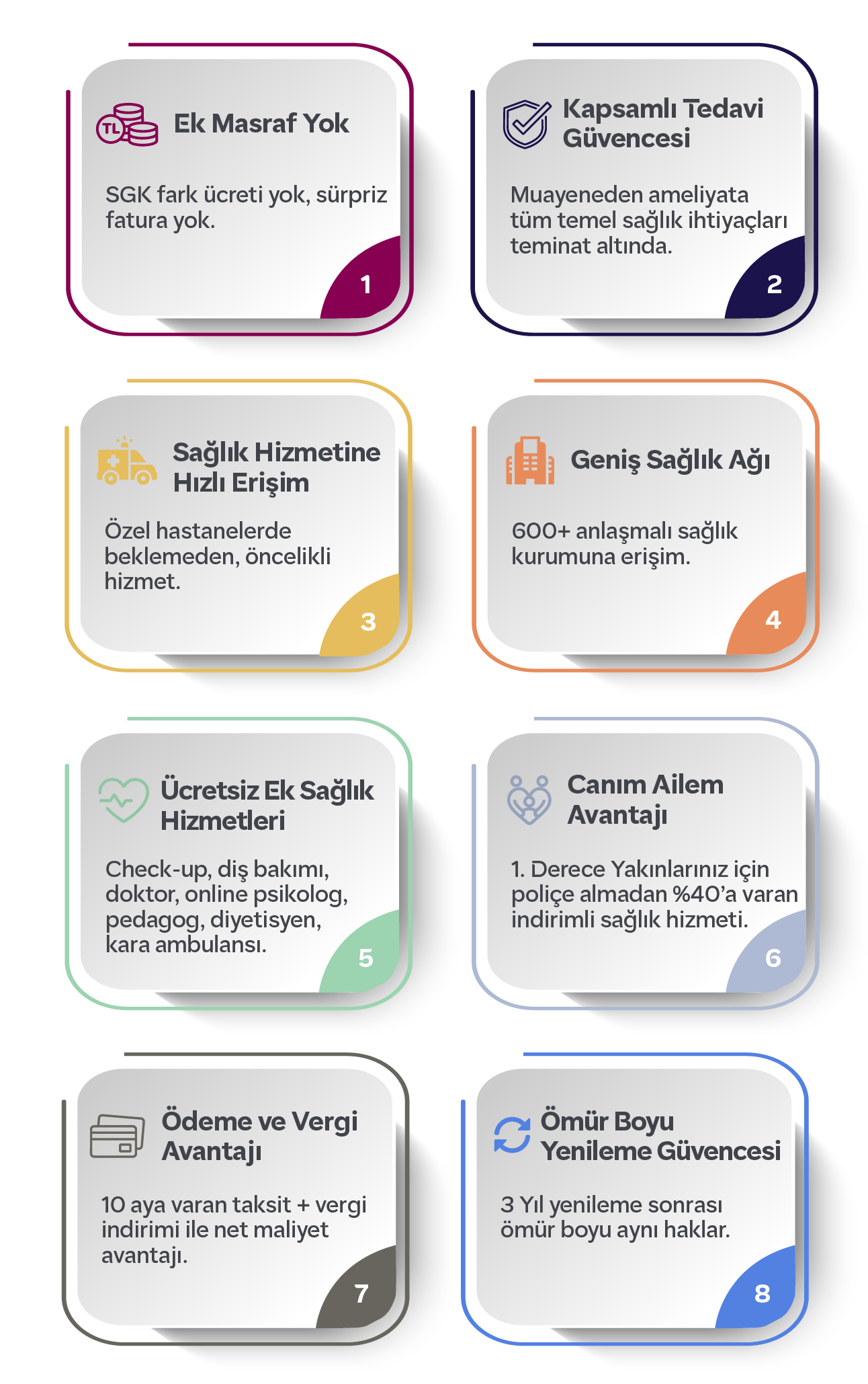 Tamamlayıcı Sağlık Sigortası (TSS), SGK’lı kişilerin anlaşmalı özel hastanelerde gördükleri muayene ve tedavilerde SGK’nın karşılamadığı fark ücretini üstlenen bir sigortadır. (Sadece 60 TL SGK katkı payı hariç). Böylece sağlık ihtiyacınız olduğunda masraf hesabı yapmak yerine, ihtiyacınız olan hizmete hızlı, kolay ve konforlu bir şekilde ulaşabilirsiniz. Çünkü bizce gerçek güven, yarını düşünürken bugünü de gönül rahatlığıyla yaşayabilmektir.